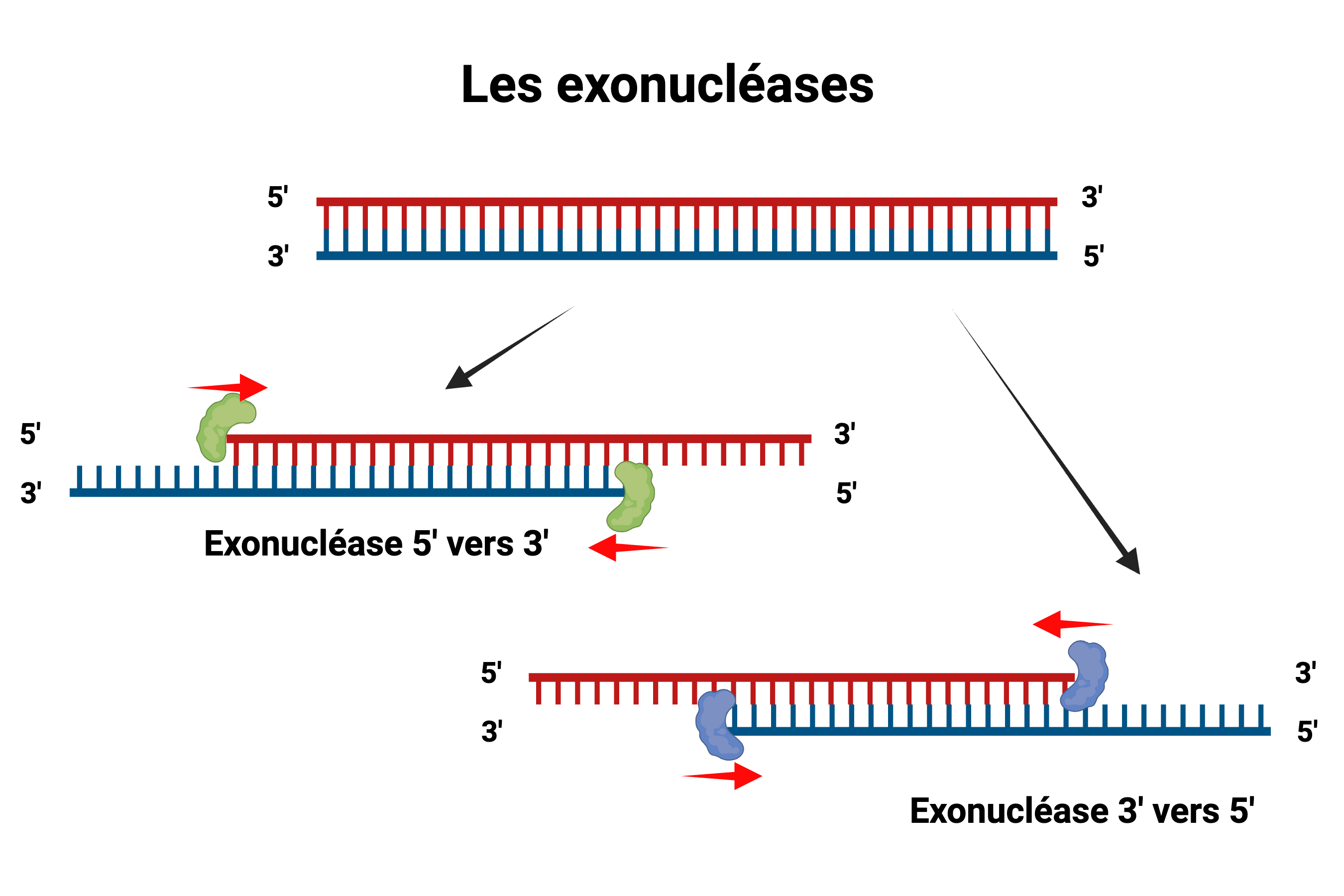 Les exonucléases peuvent agir sur l'ADN double brin ou simple brin, à partir de l'extrémité 5' ou à partir de l'extrémité 3'.