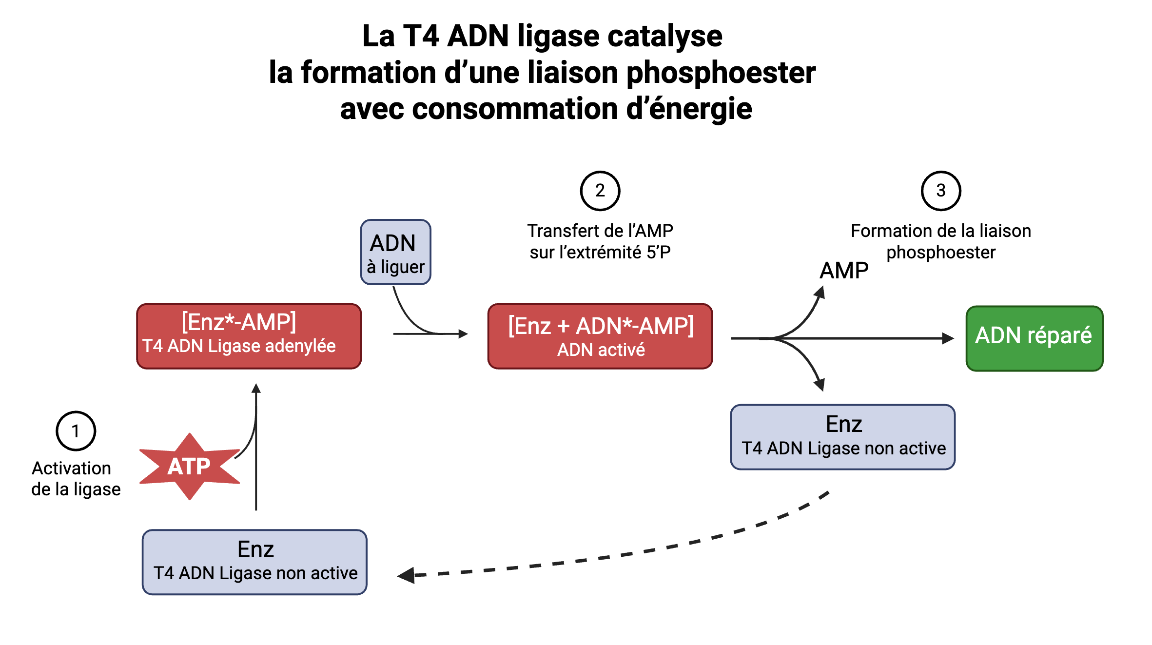 La T4 ligase catalyse la formation d'une liaison phosphoester. Pour agir, la ligase doit être activée.
