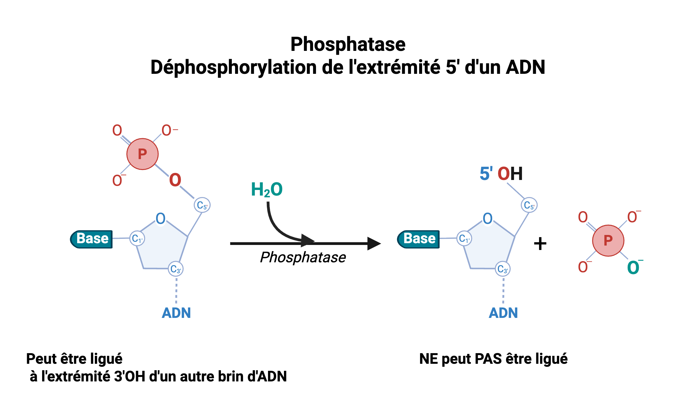 Les phosphatases sont des outils essentiels du clonage d'ADN. Elles permettent de diriger la ligation, en déphosphorylant les extrémités 5'-phosphate (5'-P) des plasmides. Le plasmide ne peut plus se recirculariser mais il peut être ligué à un insert phosphorylé.