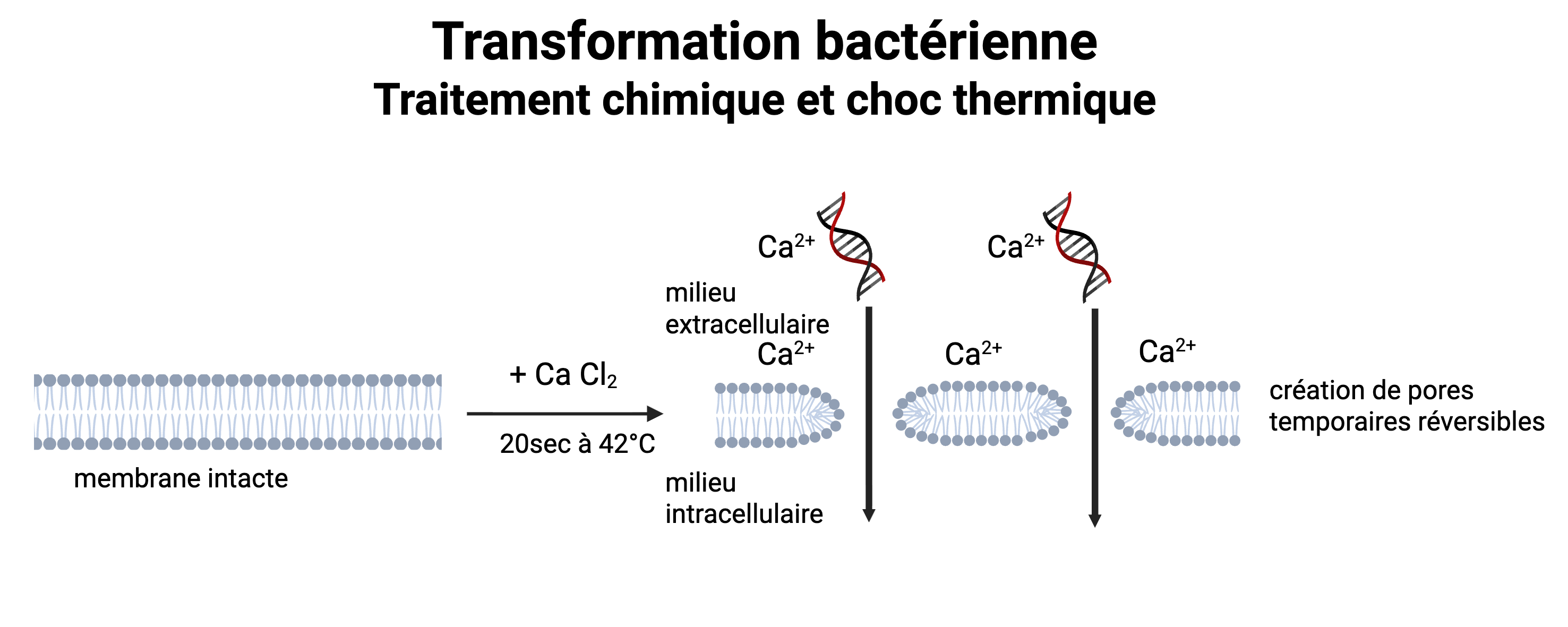 La transformation chimique repose sur un traitement des bactéries par des ions calcium (Ca2+). Ces ions neutralisent partiellement les charges négatives portées à la fois :